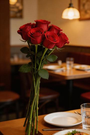 一张木质餐桌作为主视觉位于画面中心,桌面纹理清晰可见,呈现出温暖的木色。背景是明亮的餐厅场景,灯光柔和,整体氛围温馨舒适,给人一种家的感觉。