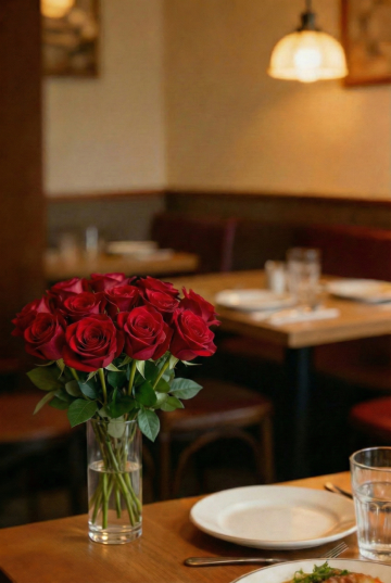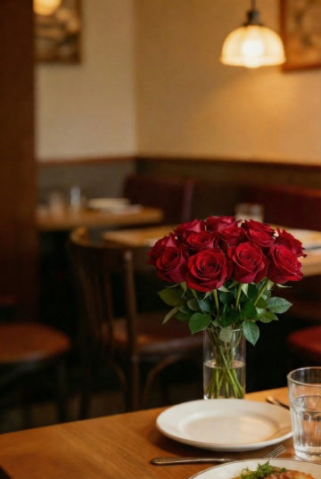温馨雅致的日式怀石料理餐厅内部场景,暖色调木质装潢与深色餐桌形成沉稳对比,天花板悬挂着散发柔和暖光的方形和纸灯笼吊灯,中央摆放着插有白色花枝的深色陶瓷高瓶,餐桌铺着素雅的浅色桌布并整齐摆放着精致的日式餐具与高脚酒杯,背景可见木质酒架与柔和灯光点缀的吧台,整体氛围宁静而富有禅意,光影柔和细腻,营造出静谧舒适的用餐环境。