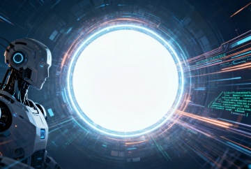 深蓝色背景上,以电路板纹理为基础,中央矗立着巨大的、立体发光的蓝色"AI"字母,字母内部有精细的电路纹路,周围环绕着流动的蓝色光效和闪烁的星点粒子,整体呈现出赛博朋克风格的科技感与未来感,具有强烈的视觉冲击力和深度感,营造出神秘而先进的氛围。