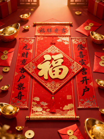 中式喜庆风格,鎏金3D立体“發”字辉映红底,搭配浮雕质感金元宝与铜钱,毛绒装饰点缀,尽显奢华重拟物风,传递新春财运亨通之寓意。