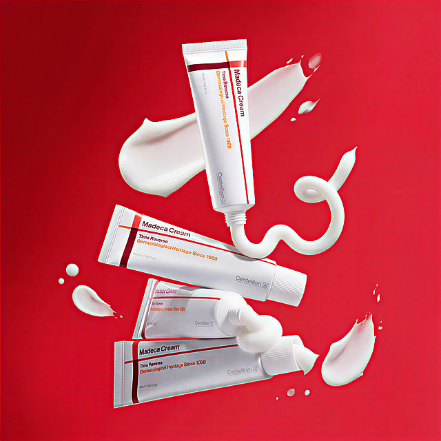 根据图中产品再结合一下提示词生成八张不一样的产品图- 专业院线风:产品置于浅灰色医美级背景上,管身倾斜45°,突出“Dermatological Heritage Since 1968”字样,冷调柔和光线,营造专业、安心的护肤氛围。右侧排列三枚认证徽章,整体构图简洁有力,突出医学护肤与抗衰修护卖点。 2. 氛围感场景图(社交种草+代入感) - 夜间修护场景:Centellian24抗衰面霜放在木质床头柜上,旁边搭配同品牌精华、香薰蜡烛与暖黄小夜灯。手取面霜轻抹在手背,柔焦暖光营造治愈氛围,突出夜间抗衰修护的仪式感。背景点缀积雪草叶片(呼应成分),强化产品天然修护力。 - 极简ins风护肤台:白色软管面霜置于米白色大理石台面上,搭配透明玻璃杯与新鲜积雪草,自然光柔和洒落,整体色调干净柔和。管身红橙线条成为视觉亮点,突出产品温和抗衰、适合敏感肌的特点,画面松弛治愈。 3. 成分与质地图(放大核心卖点) - 质地特写:白色软管挤出绵密乳霜质地,指尖推开后呈现水润光泽,柔光捕捉细腻肌理,背景为纯净浅灰。特写积雪草叶片与面霜同框,突出产品修护抗衰的核心成分,画面干净有说服力。 - 成分可视化:面霜质地特写,周围环绕半透明积雪草活性分子特效,冷光背景下凸显成分活性与修护力。软管包装一角入镜,强化品牌识别,适合突出科技抗衰的内容场景。详情