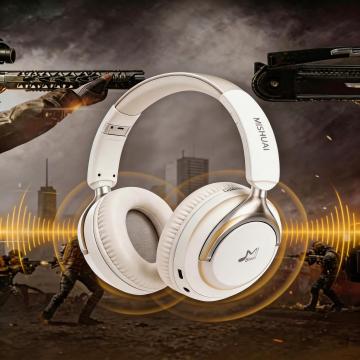 一副白色的头戴式无线蓝牙耳机,采用现代简约的设计风格,机身线条流畅圆润,头梁和耳罩外侧为光滑的白色哑光塑料材质,耳罩内侧是黑色的柔软透气记忆海绵,表面覆盖细腻的黑色织物,头梁内侧有黑色的皮质软垫。耳机以45度角略微倾斜的角度悬浮在浅色(接近白色)的纯净背景上,光线从左上方柔和照射,在耳机右侧和下方形成淡淡的灰色阴影,突出耳机的立体轮廓和材质质感,整体呈现出专业、高端、科技感的产品展示氛围。