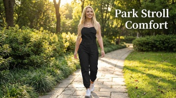 一位女性迎着晨光,轻松自信地走在城市街道上