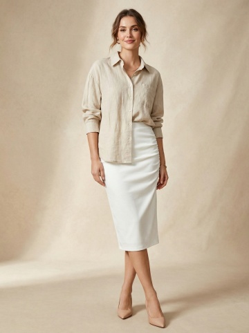 巴黎街角咖啡馆,优雅女性身着米色亚麻衬衫与白色半裙,轻拟物风面料质感,简约主义设计,文艺感与时尚感交织,实景感十足。