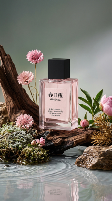现代感与光影交织,玻璃风瓶身透出清透优雅,金属质感点缀奢华,3D渲染强化细节,重拟物风格呈现真实触感,营造沉浸式时尚美学体验。