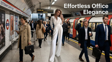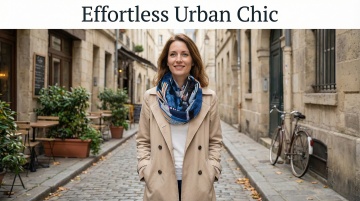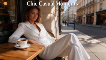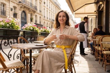 巴黎街角咖啡馆,优雅女性身着米色亚麻衬衫与白色半裙,轻拟物风面料质感,简约主义设计,文艺感与时尚感交织,实景感十足。