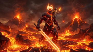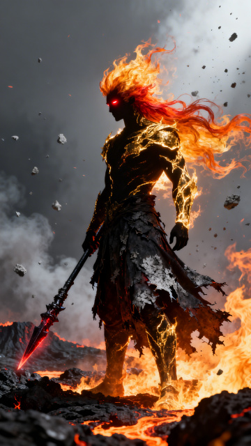 火焰与金属交织的3D重拟物风格,神秘而神圣的战士立于熔岩之上,红色眼眸与燃烧长发迸发热血感,粒子飞溅中尽显冲击与严峻。