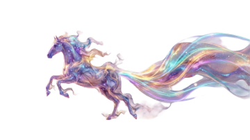玻璃风透明红马跃于星河,光影流动,粒子闪烁,融合梦幻与神圣感,3D重拟物设计展现未来奢华之美。