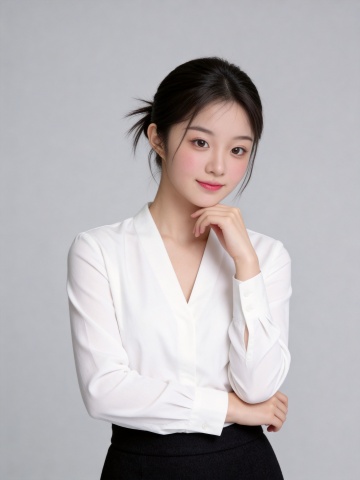 温柔杏色西装套装手抵下巴女士形象照