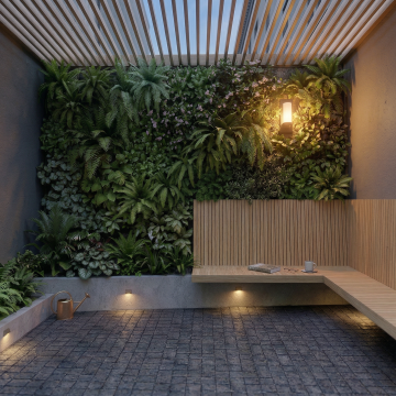 现代简约风格庭院设计,浅灰色木质甲板地面中央摆放着圆形混凝土餐桌,桌上有一盘水果,两侧是木质长椅,背景为白色矮墙,墙前种植着多种绿色植物,包括大型观叶植物和低矮灌木,左侧有高大树木,枝叶呈现绿色与橙黄色渐变,右侧有黑色金属框架木质顶棚,地面铺设白色鹅卵石与灰色石板台阶,整体采用自然光线,光影分明,色调以白色、灰色、木色和绿色为主,营造出宁静、舒适、具有高级设计感的户外休闲空间。