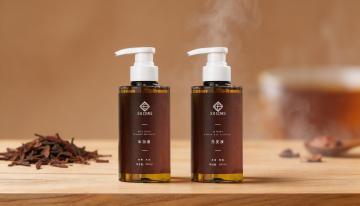 洗发水海报,两瓶深棕色透明液体洗发水瓶,带有黑色按压泵头和白色标签,标签上有黑色文字和金色装饰,瓶身放置在浅棕色木质树枝上,树枝下方有湿润的水面和石头,旁边点缀着绿色植物枝叶和根茎,整体采用温暖的棕黄色调,柔和的侧光照明,营造出自然、有机、纯净的氛围,背景为渐变的米黄色,画面具有清晰的视觉层次,突出产品主体,光影效果细腻,水面有清晰的倒影,质感写实,设计简约自然,传达出天然、植物萃取的产品特性。