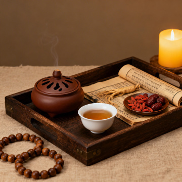 古朴典雅的中式书房一角,深棕色背景墙营造出沉稳静谧的氛围,柔和的侧光从左上角斜射而下,在墙面投下细腻的光影层次。一张深色实木案几上,铺展着一卷泛黄的古籍,书页边缘微微卷起,纸张纹理清晰可见。案几右侧放置着一件精巧的紫檀木笔架,雕刻有缠枝莲纹,底部三足呈兽蹄状,木质表面光滑温润,展现出岁月沉淀的包浆质感。案几边缘有自然的木纹和轻微的做旧痕迹,左侧隐约可见部分雕花屏风的一角,整体画面充满传统文人气息,光影柔和,色调统一,细节丰富,营造出宁静致远的东方美学意境。