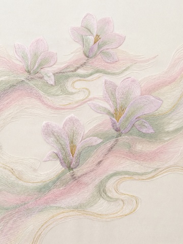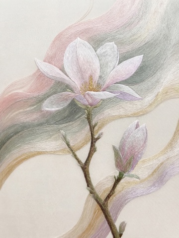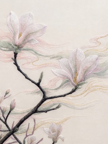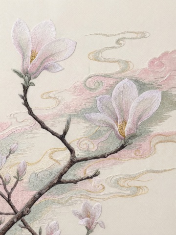 中国传统工笔花鸟画风格,左侧大面积留白的纵向构图,右侧以细腻线条勾勒的盛开白玉兰花枝,搭配墨绿色叶片,整体色调改为青绿色背景上点缀淡紫色花苞,营造清雅宁静的自然景观氛围,线条工整细致,色彩过渡柔和,具有古典雅致的装饰美感。