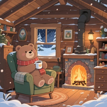 3D重拟物风,油画质感渲染冬日木屋暖炉场景,光影交织营造静谧温馨氛围,质朴家具与窗外雪林呼应,尽显舒适与宁静的节日气息。