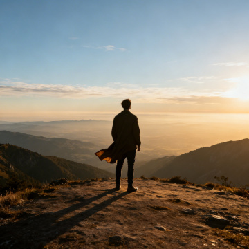 一位穿着深色户外服装的登山者背对着镜头站在覆盖着皑皑白雪的陡峭山峰之巅,俯瞰着脚下云海翻腾的壮丽山脉全景,天空呈现出温暖的橙红色调,云彩被染上柔和的霞光,整体画面采用超写实主义风格,光影效果细腻,云海与山峦的层次感分明,营造出宁静而壮阔的氛围,色调从原图的蓝白色系转变为温暖的橙红色系,保持原有的构图和细节质感。