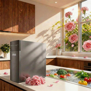 俯视角构图,极简主义厨房场景中央,一台哑光白前置式滚筒洗衣机舱门呈优雅的45度角半开状态,露出内部精密的银色不锈钢内筒与几何排列的波浪提升筋,正面圆形旋钮控制面板镶嵌着冰蓝色LED显示屏,机身侧面的激光雕刻竖纹在斜射的自然光下形成细腻的光影层次。洗衣机静置在深海蓝水磨石地面上,倒映出机身流畅的轮廓线,背景是渐变的冰川蓝哑光墙面,右侧悬挂着由黄铜支架固定的透明玻璃搁板,上面整齐排列着三瓶不同容量的薰衣草香薰洗衣液,液体在光线折射下呈现出淡紫色光晕。整体色调以冷调白与深海蓝为主导,金属部件反射出柔和的高光,营造出兼具专业实验室般的精确感与居家空间的温馨氛围。