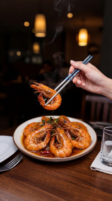 写实风格美食摄影,特写镜头下的黑色圆形瓷盘,盘中整齐排列着五只橙红色煮熟的鲜虾,虾身饱满有光泽,虾头点缀着黑色胡椒粒,虾须自然舒展,盘边装饰着翠绿的迷迭香枝叶和两块切片青柠,整体构图呈三角形视觉引导,主色调为橙红、墨黑与翠绿的对比色搭配,侧上方柔和的柔光照射,在虾身上形成明亮的高光和细腻的阴影,背景变换为木质餐桌,桌面上散落着几片迷迭香叶子和少许白色粗盐颗粒,营造出温馨自然的家庭烹饪氛围,画面质感细腻,细节清晰,色彩饱和,光影层次丰富,突出海鲜的新鲜与美味。