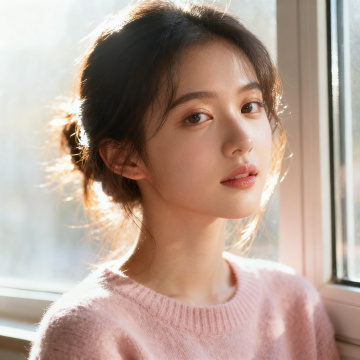 写实风格人像摄影,美女主体,棕色微卷长发,明亮有神的眼睛,自然微笑,柔和面部光影,阳光明媚的午后光线,温暖柔和的色调,波光粼粼的蓝色湖面背景,湖边木质栈道环境,穿着米色针织开衫搭配白色吊带裙,浅色系穿搭,发丝随风轻扬,清晰的皮肤质感,自然的妆容,高清晰度,浅景深,人物居中构图,宁静惬意的氛围。
