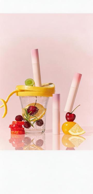 质朴自然肌理与光影交织,木雕风枯木叠岩托起琥珀色精华瓶,轻拟物风果实点缀,营造出优雅文艺的实景感。