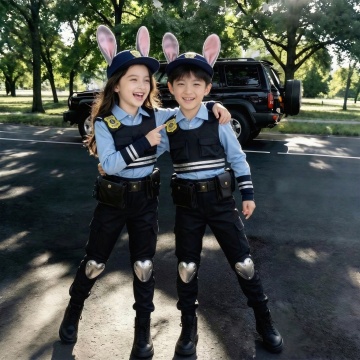 一位可爱俏皮的警察小宝贝,穿着小警服,在执行任务,旁边有一辆警车