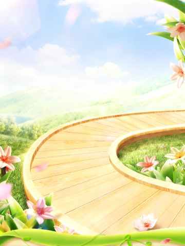 画面中心是一个粉色展台,展台为圆形,底部是粉色的,顶部是浅蓝色的。展台周围是绿色的草地,草地上开满了粉色的花朵。背景是粉色的天空,天空中有许多粉色的云朵,远处是绿色的山丘,山丘上也开满了粉色的花朵,山丘之间有一条小河。整个画面充满了春天的气息,色彩柔和,给人一种温馨、浪漫的感觉。