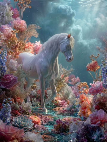 梦幻水下花园,白马踏花而行,光影流转间尽显唯美浪漫。3D超现实风格融合油画质感,粒子飘浮,清透如梦,虚拟自然中的优雅诗意。