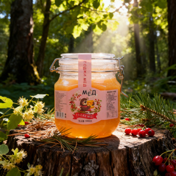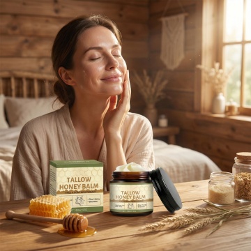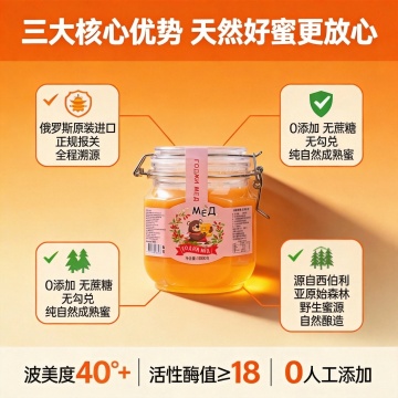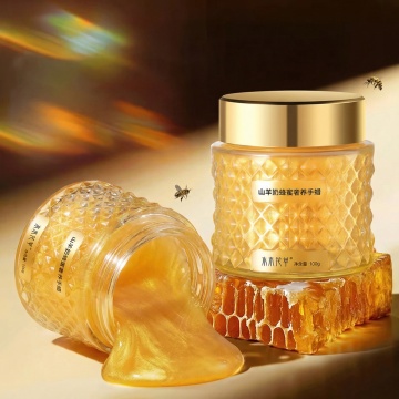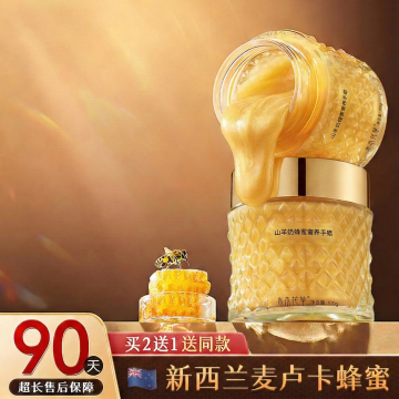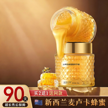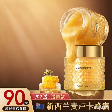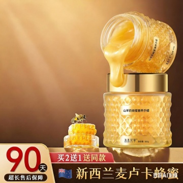超写实摄影风格,温暖明亮的光线从斜上方照射,金色蜂蜜从木制蜂巢棒上缓缓滴落,覆盖在六边形纹理清晰的蜂巢上,蜂巢置于透明玻璃盘中,盘中盛有少量液态蜂蜜,背景为模糊的橙黄色秋叶,前景左侧摆放一朵白色小雏菊,木质桌面上放置装有琥珀色蜂蜜的玻璃罐,整体色调以金黄、橙黄、原木色为主,营造出自然、纯净、甜蜜的氛围,高清晰细节展现蜂蜜的粘稠光泽与蜂巢的精致结构。