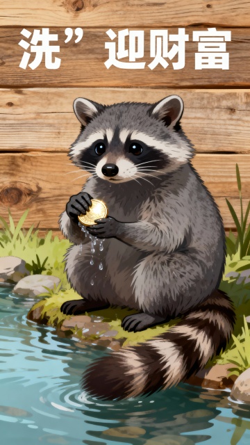 可爱拟人浣熊水边洗金 coin,卡通插画风,水彩质感,寓意“洗”迎财富,节日喜庆氛围浓厚。