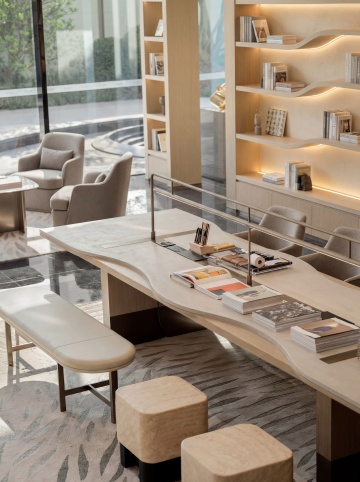 俯瞰视角,极简主义风格客厅以深邃的墨黑与温润的原木色为基调,倾斜45度的构图展现出几何切割般的空间层次感。清晨的冷蓝色光线从整面无框玻璃墙斜射而入,在深灰色微水泥地面上投下窗格的几何阴影,窗外是被薄雾笼罩的城市天际线剪影。中央悬浮着一个由黑色金属框架与烟熏玻璃台面构成的不规则多边形茶几,周围环绕着三张浅灰色模块式布艺单人沙发,每个沙发配有一个芥末黄皮质靠垫。右侧墙面是整面的胡桃木饰面板,内嵌线性LED灯带勾勒出隐藏式储物空间的轮廓。天花板采用悬浮式设计,中央垂挂着一个由12个不规则玻璃球体组成的艺术吊灯,在地面投射出破碎的光斑图案。空间角落摆放着一株大型琴叶榕,其深绿色叶片与整体冷色调形成鲜明对比。地面铺设着一块巨大的米白色羊毛手工编织地毯,边缘处有渐变的黑色几何图案。整体氛围呈现出一种冷静的奢华感,光线在不同材质间的反射创造出丰富的视觉层次,既保留了原空间的通透感,又通过色彩与光影的转变赋予其北欧极简的清冷美学。