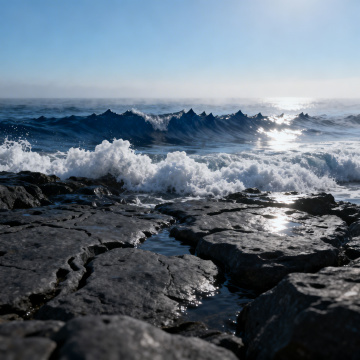 从高处俯瞰视角,纯净的浅蓝色海水,波光粼粼,海面上有白色的波浪,海浪拍打在沙滩上,溅起白色的浪花,远处是浅蓝色的天空,海天相接,画面清新、宁静、明亮,具有自然、简约的风格,色调和谐统一,光影柔和,营造出一种舒适、放松的氛围。