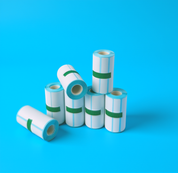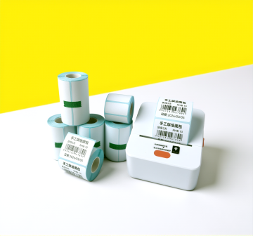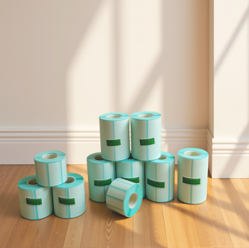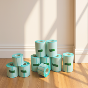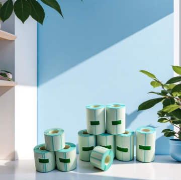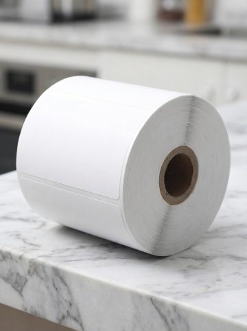 现代感与实景感结合,简约主义风格呈现,标签卷置于大理石台面,干净利落,极简美学。
