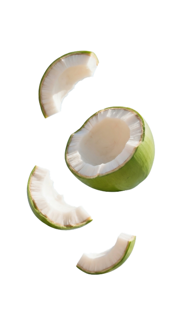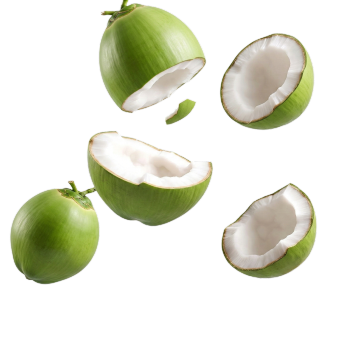 白底背景上,新鲜的椰子组合,一个完整的棕色带纹理的椰子和两个被切开的椰子,露出洁白厚实的椰肉,旁边点缀着几片长条形的绿色椰子叶,整体呈现出高清写实的摄影风格,光线明亮柔和,突出椰子的自然质感和细节,构图简洁大方,具有清晰的产品展示效果。