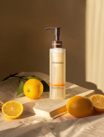 现代感与优雅感交融,轻拟物风设计搭配金属风瓶身,清透光影中展现奢华质感,柔和色调传递舒适美学,性冷淡风背景凸显产品高级感。