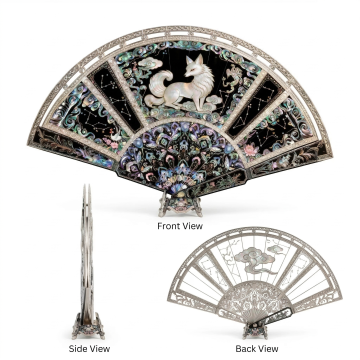 工笔与水墨交融,扇面绘山水人物,古典优雅,鎏金点缀,尽显中式美学与民族韵味,插画风呈现复古唯美意境。