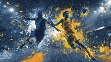 插画风格,夸张的篮球运动员扣篮动作,侧身跃起,右手持球举过头顶,红色球衣印有黄色数字“10”,蓝色短裤带黄色侧边条纹,蓝色运动鞋,粉色袜子,背景有黑色速度线表现动感,整体采用鲜艳明快的色彩,线条流畅,色块分明,人物肌肉线条夸张突出,充满力量感和运动张力。