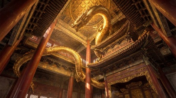 鎏金飞檐映蓝天,重拟物风展现中式古典庄严,浮雕细节与光影交织,尽显国潮奢华与神圣体积感。