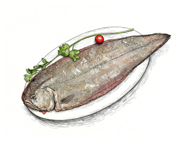 复古版画风,白描手法展现鱼类与坚果,线条细腻,质感生动。