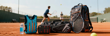 动漫风格插画,一位男性网球运动员正全力挥动球拍击球的瞬间,红色运动服搭配深色短裤,白色运动鞋与长袜,背景由大块面的蓝色、白色和红色几何色块构成,呈现出动态的倾斜角度和速度感,线条流畅且富有张力,整体色彩鲜明对比强烈,人物姿态舒展充满力量,画面传达出运动的激情与活力,扁平化设计语言,简洁而富有冲击力的视觉效果。