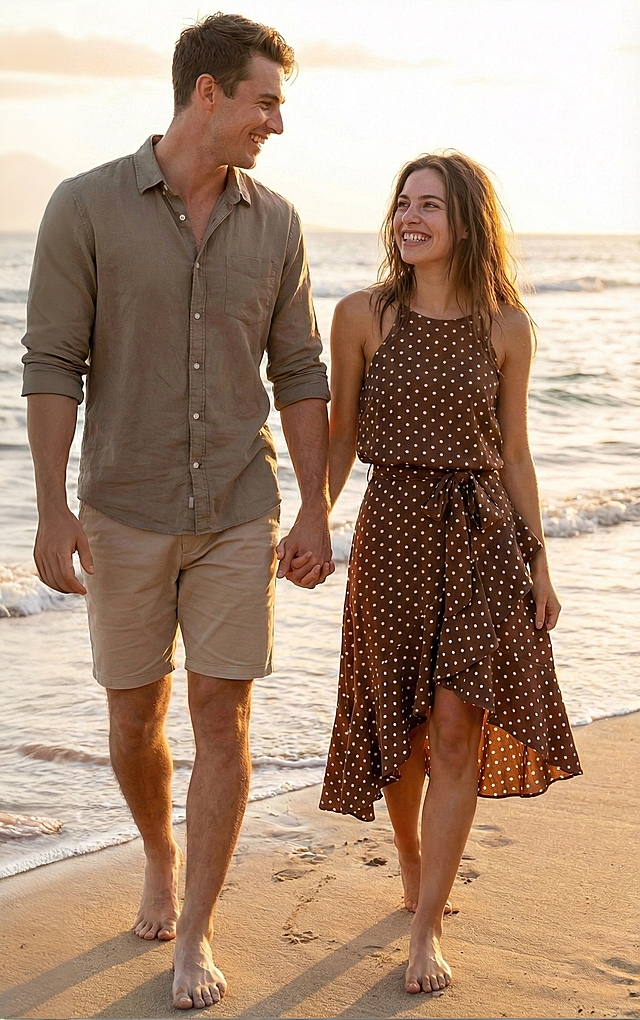欧美女性头戴图中的玳瑁花纹发箍,远景拍摄,真实自然的效果,海边度假穿搭,背景为海边沙滩场景,画面真实有质感,无违和感详情