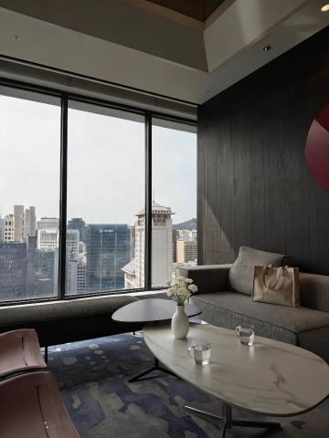 俯瞰视角,极简主义风格客厅以深邃的墨黑与温润的原木色为基调,倾斜45度的构图展现出几何切割般的空间层次感。清晨的冷蓝色光线从整面无框玻璃墙斜射而入,在深灰色微水泥地面上投下窗格的几何阴影,窗外是被薄雾笼罩的城市天际线剪影。中央悬浮着一个由黑色金属框架与烟熏玻璃台面构成的不规则多边形茶几,周围环绕着三张浅灰色模块式布艺单人沙发,每个沙发配有一个芥末黄皮质靠垫。右侧墙面是整面的胡桃木饰面板,内嵌线性LED灯带勾勒出隐藏式储物空间的轮廓。天花板采用悬浮式设计,中央垂挂着一个由12个不规则玻璃球体组成的艺术吊灯,在地面投射出破碎的光斑图案。空间角落摆放着一株大型琴叶榕,其深绿色叶片与整体冷色调形成鲜明对比。地面铺设着一块巨大的米白色羊毛手工编织地毯,边缘处有渐变的黑色几何图案。整体氛围呈现出一种冷静的奢华感,光线在不同材质间的反射创造出丰富的视觉层次,既保留了原空间的通透感,又通过色彩与光影的转变赋予其北欧极简的清冷美学。