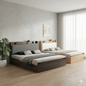 极简风格卧室室内设计,以浅米色墙面为背景,搭配原木色实木床架,铺着浅灰色亚麻质感床单,床头摆放两个浅米色方形靠枕和两个浅灰色长条形枕,床尾随意搭着一条米白色针织毯。床的左侧是原木色床头柜,上面放置一个白色陶瓷小花瓶,插着几根干枝,旁边有一个白色小茶杯和托盘。床头柜上方墙面挂着一幅极简风格装饰画,画框为原木色,画面是三束黑色线条勾勒的麦穗图案。床的右侧是一盏白色金属落地灯,灯罩为米白色布艺材质。床前浅色木地板上铺设一块米白色长方形棉麻地毯,地毯上放着一个圆形编织篮,篮子里有一本翻开的书。整体色调以米色、浅灰、原木色为主,光线柔和,营造出宁静、舒适、简洁的氛围,空间布局对称平衡,线条干净利落,无多余装饰,体现极致的简约美学。