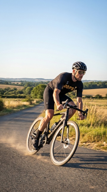 一位戴着头盔、背着双肩包的山地自行车手,正站在山地自行车旁,一手扶着车把,另一手抬起指向远方的天空,夕阳的光芒从他身后照射过来,形成鲜明的剪影效果,他穿着长袖骑行服和短裤,站在长满草的山顶上,背景是壮丽的日落天空,天空中布满了蓝色和橙色渐变的云彩,远处的山峦在霞光中若隐若现,整个画面充满了探险和自由的氛围,具有强烈的视觉冲击力和艺术感。