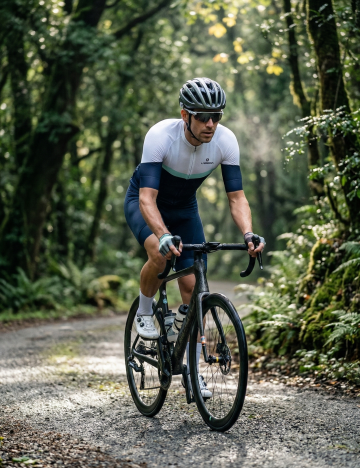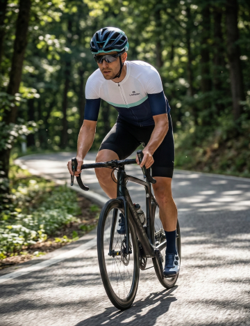 卡通风格插画,一位戴着橙色头盔的男性正在骑红色自行车,他穿着蓝色短袖T恤和黑色短裤,戴着蓝色手套和蓝色运动鞋,身体前倾,双腿蹬踏,自行车车轮为黑色辐条轮,整体画面简洁明快,色彩鲜明,线条流畅,无背景,人物表情略带微笑,姿态充满动感。