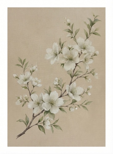 插画风与水彩风融合,柔和色调呈现春日清新感,扁平化设计增强舒适感,枝头梅花绽放,传递静谧节日氛围。