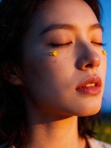 胶片风质感,光影温柔洒落,花瓣轻贴脸颊,朦胧中透出清透与浪漫,营造静谧唯美的文艺氛围。