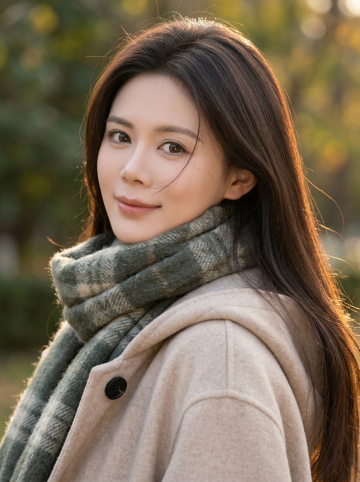 写实风格人像摄影,亚洲美女,长卷发,明亮有神的眼睛,自然微笑,白皙肌肤,穿着复古格纹背带裙搭配白色泡泡袖衬衫,站在秋日落叶纷飞的公园湖边,阳光透过树叶洒下斑驳光影,湖水呈现温暖的琥珀色调,整体氛围清新治愈,高清细腻质感,柔和自然光线,浅景深,突出主体人物。