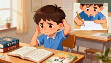 3D风格小男孩,小学生形象,戴黑色眼镜,黑色短发,穿着蓝色短袖,侧面视角。小男孩坐在木质写字台前写作业,身体弓着背,头部前倾靠近作业本,姿势不正确。书桌远端放置一盏白色台灯,灯光柔和照亮桌面,书桌近端堆叠一摞彩色封面的书本,书本高度不遮挡小男孩和作业本,背景为简洁的白色墙面,整体画面干净整洁,突出人物动态和场景细节。