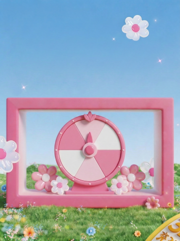 画面中心是一个粉色展台,展台为圆形,底部是粉色的,顶部是浅蓝色的。展台周围是绿色的草地,草地上开满了粉色的花朵。背景是粉色的天空,天空中有许多粉色的云朵,远处是绿色的山丘,山丘上也开满了粉色的花朵,山丘之间有一条小河。整个画面充满了春天的气息,色彩柔和,给人一种温馨、浪漫的感觉。