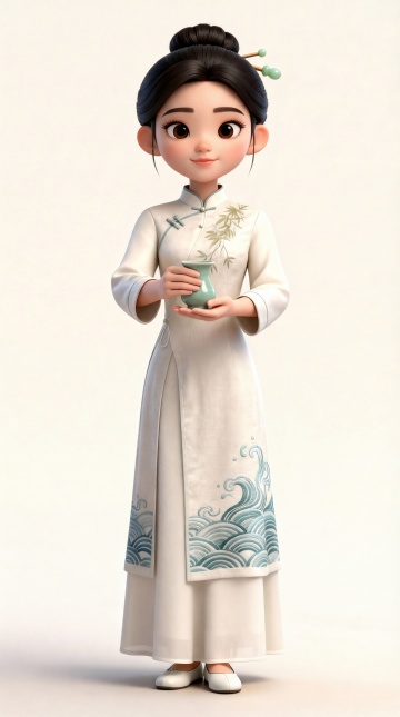3D风格中式古风角色,质朴布料质感,古典服饰设计,展现传统美学与现代动画融合。