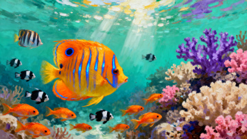 水彩风插画,金鱼在深蓝水墨中游弋,梦幻朦胧,柔和清新,虚拟自然意境。